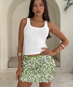 Sitting low on the waist with shimmering sequins, our Idalia Mini Skirt will make a statement on your next night out, pair with our Sedona Tank for the complete look. – Mini length- Low waisted – Side seam invisible zipper- Lined, non-stretch- Body: 100% Polyester, Lining: 95% Polyester u0026 5% Elastane Please refer to care label for garment care instructions. Colours may appear slightly different to the website due to lighting, computer picture resolution and monitor settings. **Due to the delicate hand stitching of the sequins, any variations are a part of this garment’s individual beauty and are not considered faults. Handle garment with care. Avoid rough surfaces and any friction. ~section~ – Length (Size S): 31cm/12inches. – If you need more help with sizing, see our size guide or email us at [email protected] ~section~ Stacy wears a size AU 8/ S/ US 4 and is 180cm tall.